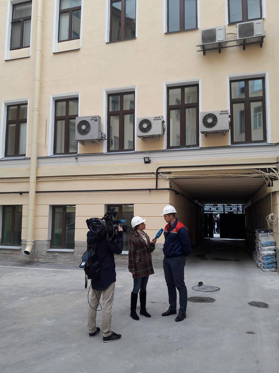 Площадь фасада – более 6300 квадратных метров. Дворовые фасады – работы завершены. Лицевой фасад – расчистка – 30%, ремонт штукатурного поля 1 этажа – 60%. Ведется ремонт балконов. Процент выполнения работ составляет 54%.